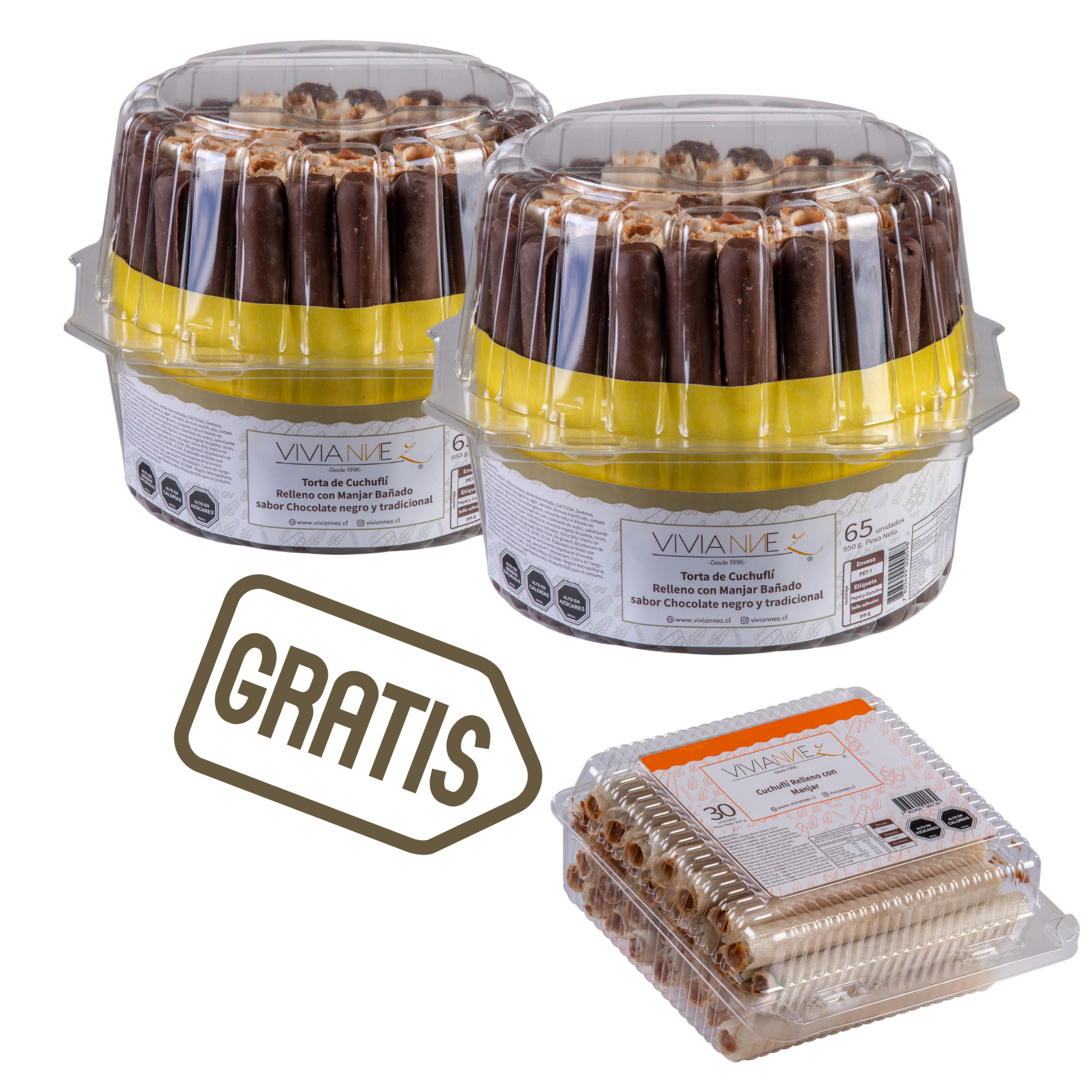 El sabor clásico de siempre, ahora en su mejor versión mixta. Este pack incluye 2 tortas de cuchuflí bañadas en manjar, chocolate negro y tradicional (65 unidades cada una) para que disfrutes lo mejor de ambos mundos.